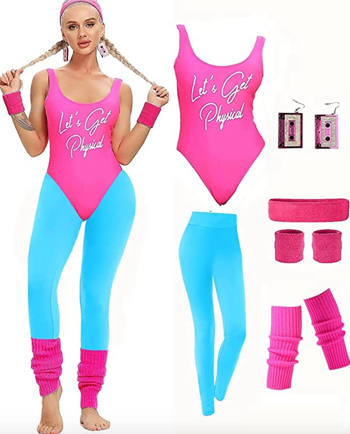 13. 1980 -იანი წლების ფიტნეს გოგონას კოსტიუმი, ნეონისფერი ელასტიკებით და ვარდისფერი აქსესუარებით