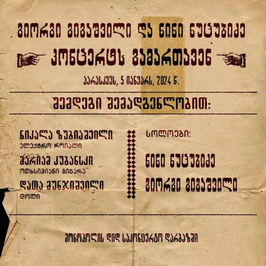 5 იანვარს Mono Hall-ში გიორგი გიგაშვილისა და ნინი ნუცუბიძის კონცერტი გაიმართება. კონცერტში ასევე მონაწილეობას მიიღებენ მუსიკოსები ნიკალა ზუბიაშვილი (კლავიში), მარიამ კუბანსკი (ბასი) და დათა მუნჯიშვილი (დრამი).