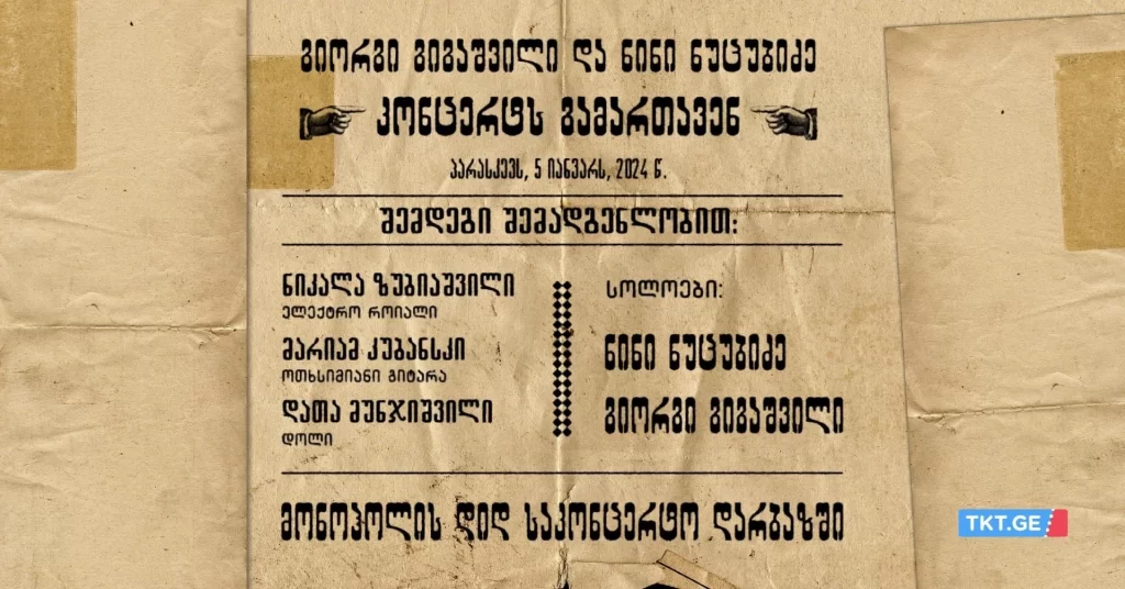 საახალწლო მუსიკალური ღონისძიებების სიაში კიდევ ერთი გამორჩეული საღამო 5 იანვარს Mono Hall-ში გაიმართება. მსმენელის წინაშე ნინი ნუცუბიძე და გიორგი გიგაშვილი წარდგებიან. ორივე მუსიკოსის დამოუკიდებელი შემოქმედებითი ცხოვრება საკმაოდ  წარმატებულია. ამჯერად კი არტისტები კონცერტს კვლავ საერთო მუსიკალური პროექტის ფარგლებში გამართავენ.