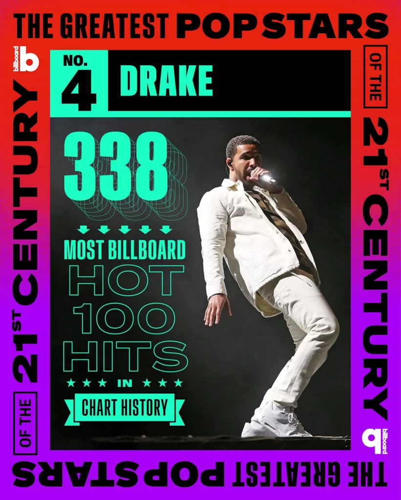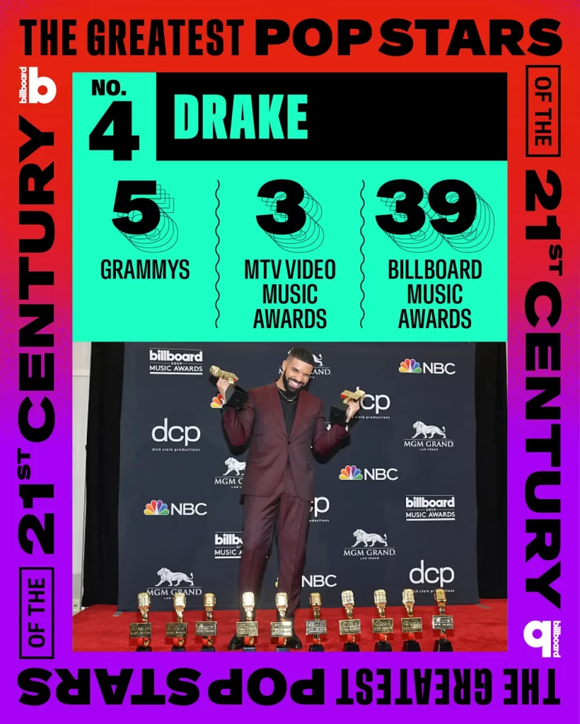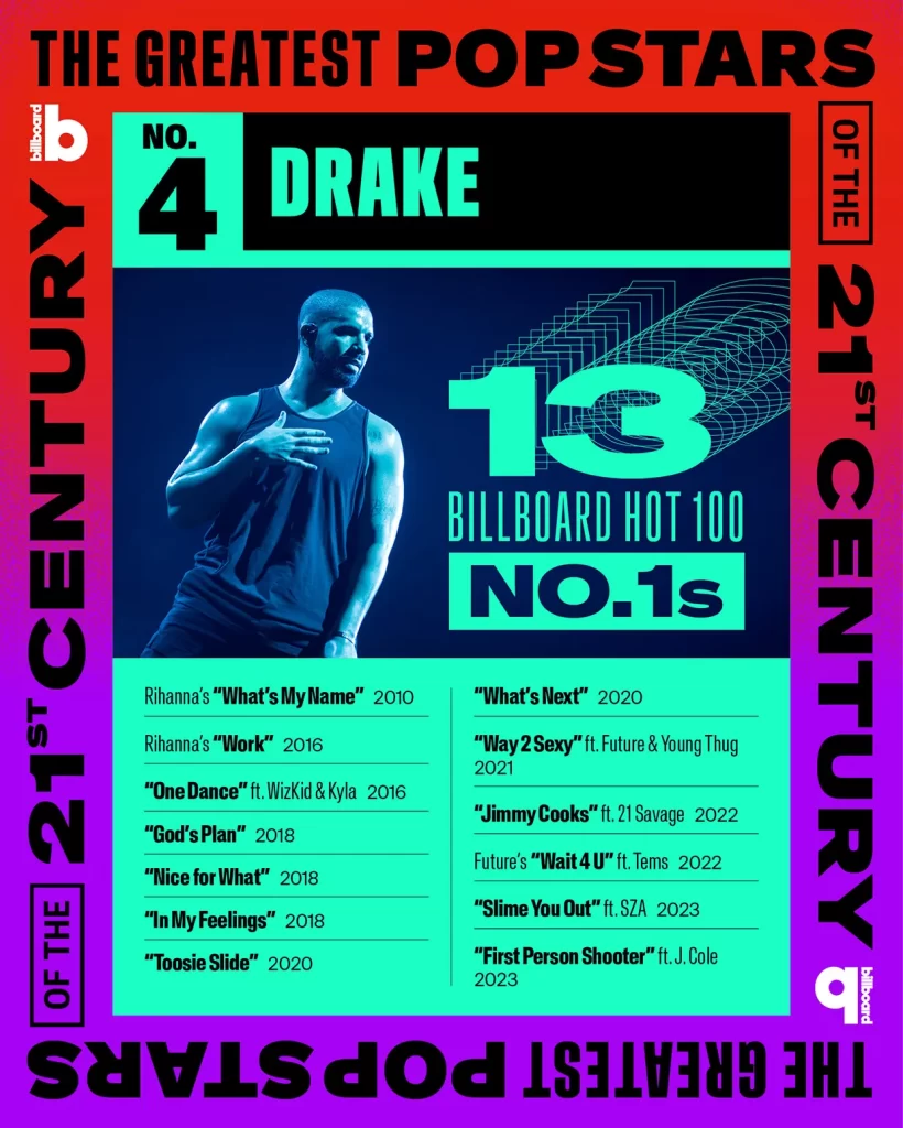 ჩარტების სტატისტიკით, დრეიკის მიღწევები 21-ე საუკუნის ყველა სხვა არტისტს ჩამოიტოვებს. ამ პერიოდის არც ერთ მუსიკოსს არ გაუმეორებია მისი რეკორდული კომბინაცია Billboard Hot 100-ის 13 ლიდერი სინგლითა და Billboard 200-ის 13 ლიდერი ალბომით. ერთადერთი, ვისაც ამ შედეგის დატრაბახება შეუძლია, Beatles-ია, რომლის ტატუც დრეიკმა მარცხენა ხელზე 2019 წელს მას შემდეგ გაიკეთა, რაც მათ „ბილბორდის” ერთ-ერთ ნიშნულში გადაუსწრო. სხვა არც ერთი პერიოდის არც ერთი არტისტი ახლოსაც კი არ მისულა დრეიკის კარიერის რეკორდთან – 338 შესვლა Hot 100-ში.