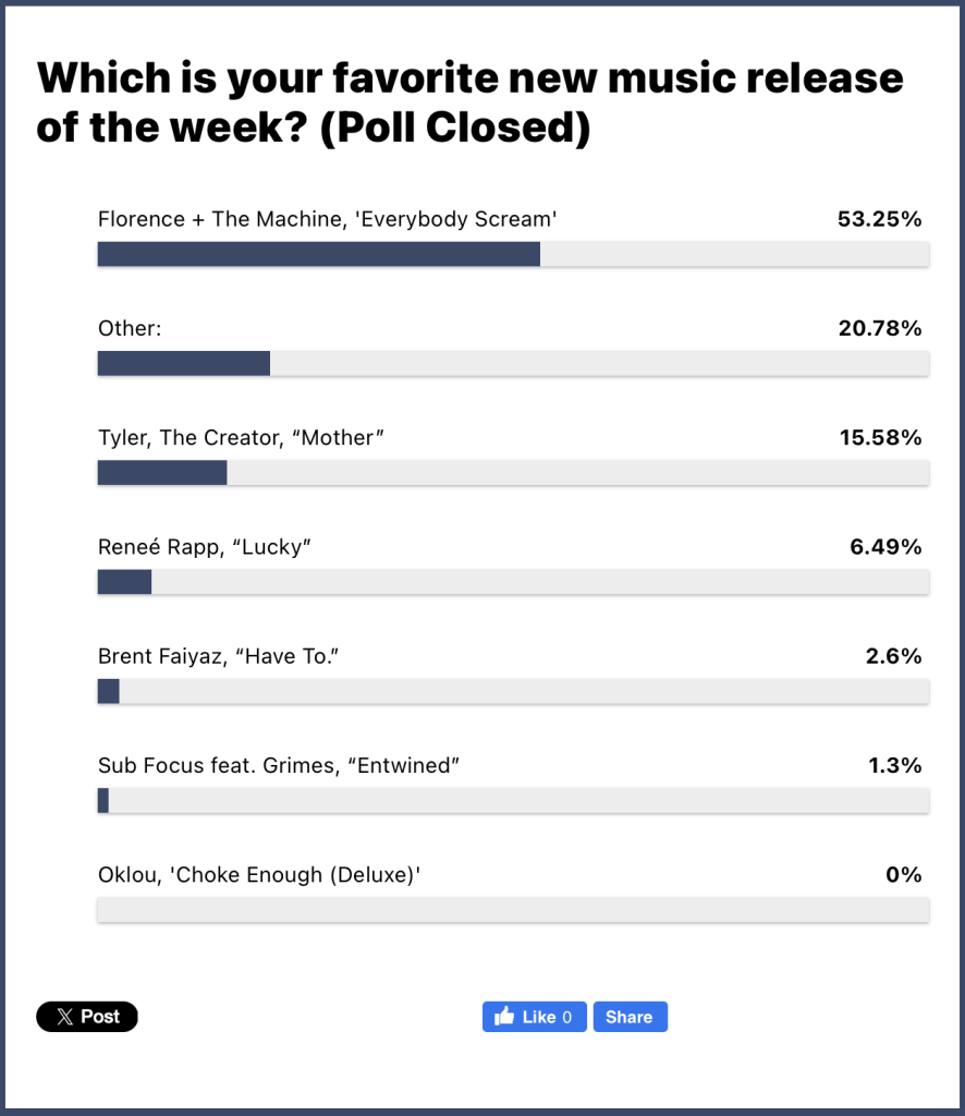 Everybody Scream ჰელოუინის დღეს გამოვიდა. ამავე კვირაში ახალი მუსიკა გამოსცეს Tyler, The Creator-მა, რენე რეპმა, ბრენტ ფაიაზმა და სხვებმა. Florence + The Machine-ის მეექვსე სტუდიურმა ალბომმა ხმების 53% დააგროვა.
