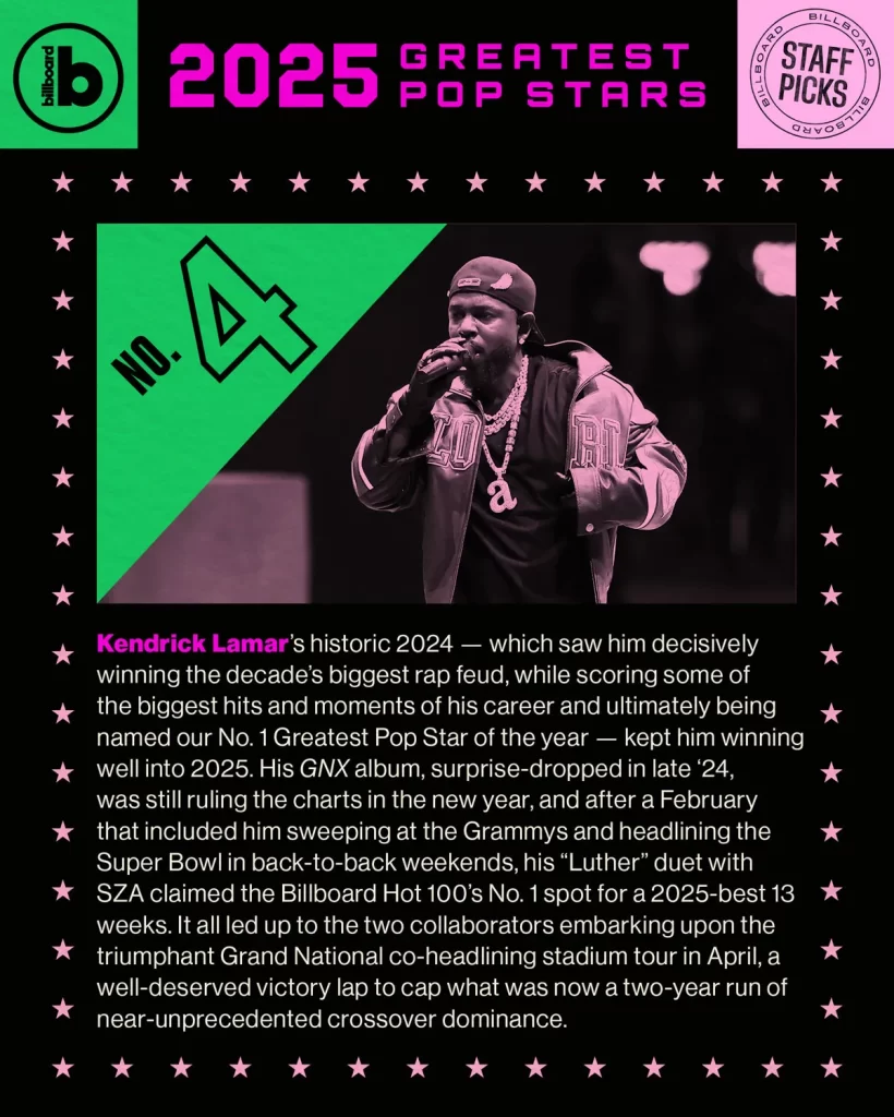 „ბილბორდი” წარმოგიდგენთ 2025 წლის უდიდესი პოპვარსკვლავების რეიტინგს, რომელსაც გამოცემის გუნდი ადგენს. სიის მეოთხე ნომერია კენდრიკ ლამარი – არტისტი, რომელმაც ჰიპ-ჰოპ ისტორიის რეკორდული შედგები კიდევ ერთ წელიწადზე განავრცო.