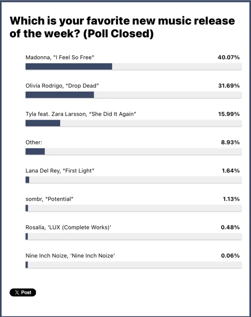 მადონას შემდეგ გამოკითხვაში მეორე ადგილს იკავებს ოლივია როდრიგოს Drop Dead (31%). მას მოსდევს ტაილასა და ზარა ლარსონის She Did It Again (16%). ხუთეულში ასევე მოხვდნენ ლანა დელ რეის First Light და sombr-ის Potential.